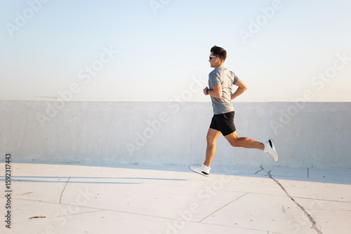 Energized young man running against a bright blue sky during golden hour