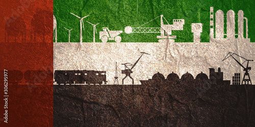 Energy and power icons set on United Arab Emirates flag backdrop. Header or footer banner. Sustainable energy generation, transportation and heavy industry.