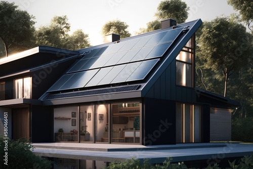 Energy Efficient House With Solar Panels And Wall Battery For Energy Storage Generative AI