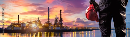 Engineer admiring stunning refinery at sunset, wearing safety gear, showcasing industrial progress with vibrant sky backdrop.