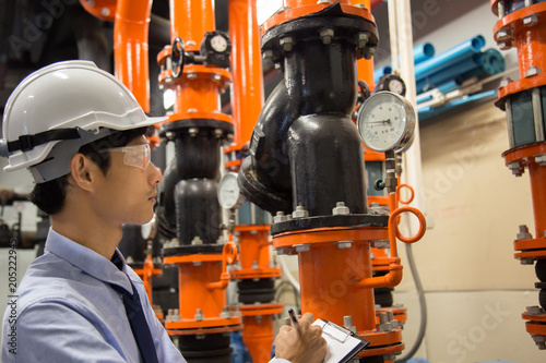 Engineer checking Condenser Water pump and pressure gauge , chiller water pump with pressure gauge.