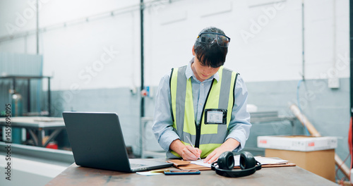 engineer, laptop, writing, factory, woman, technology, manufacturing, planning, employee, company, man, work, tech, paper, note, paperwork, industrial, check, schedule, distribution, checklist, reminder, business, female, computer, working, person, table, desk, digital, information, businessperson, job, plant, logistic, cyberspace, warehouse, web, management, workplace, safety, workshop, career, document, engineering, report, paper, vest