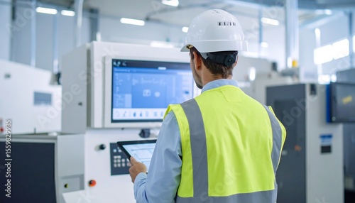 engineer, technician, men at work, factory, manufacturing, industry, production, machine, machinery, technology, control panel, digital, screen, tablet, maintenance, quality control, industrial, modern, equipment, operation, process, automation, workplace, safety, helmet, vest, professional, checking, monitoring, operating, inside, indoor, man, male, caucasian, adult, real people, sharpened, blur, light, backview, working, facility, plant, building