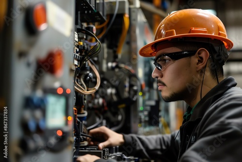 engineer, wear, safety, helmet, glasses, sharpened, work, industrial, machinery, manufacture, factory, electrical, control, mechanic, fitting, layout, maintenance, technician, compliance, precision, workplace, monitor, protection, assembly, component, technology, inspection, system, equipment, management