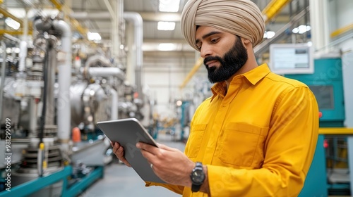 Engineer wearing a turban using a tablet to inspect machinery in a factory