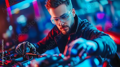 engineer, circuit board, futuristic, ai, technology, cybernetic, automation, research, laboratory, innovation, science, engineering, high technology, artificial intelligence, hardware, software, experiment, development, precision, design, industry, tool, technically, modern, robotic, prototype, glowing, workshop, researcher, mechanical, cutting edge, computing
