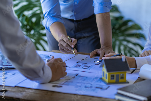 Engineering team meeting for colleagues discussing and reviewing blueprints at desk in office Engineers and workers planning for construction and renovation building projects in workplace