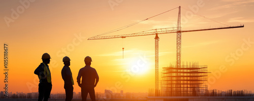 Engineers overseeing construction progress on a building site at sunset, with silhouetted crane and scaffolding in the background