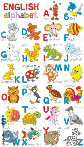 animal, alphabet, english, rudiments, funny, preschool, school, cartoon, illustration, clip art, vector, set, collection, ant, bird, cat, kitten, dog, puppy, elephant, fish, goat, hen, iguana, jellyfish, kangaroo, coccinellidae, monkey, nestling, chick, chicken, owl, owlet, penguin, quail, rooster, snail, tortoise, turtle, unicorn, vulture, whale, yak, zebra