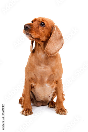 animal, background, beautiful, brown, canino, closeup, cocker, cute, dog, domestic, face, feather, friends, front, fur, gold, head, isolated, looking, mammal, pet, puppy, purebred, single, sitting, skin, studio shot, terrier, view, white, young