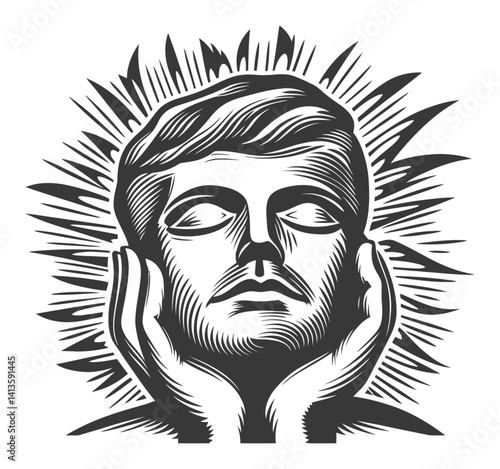 engraving, portrait, art, illustration, black, white, face, hand, expression, male, serene, peaceful, ray, abstraction, design, artwork, creativity, graphic, figure, sculptural, vintage, style, aesthetic, emotion, simplistic, detail, craft, human, gesture, coiffure, texture, imaginative, concept, visual, authenticity, classic, nature, elegance, inspiration, symbol, representation, harmony