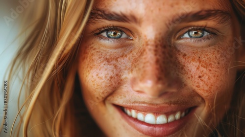 Enhance the freckles on a young woman's face. Make her eyes appear more blue. Give her a warm smile.