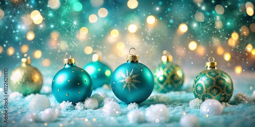 Enhance your Christmas spirit with a cheerful teal banner featuring festive ornaments and snowflakes, perfect for creating a joyful and inviting holiday atmosphere.