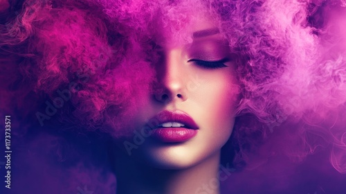 woman, face, portrait, model, beauty, make-up, hair, eye, lip, smoke, pink, purple, colours, fashion, style, art, surreal, dreamy, aesthetic, photo, studio, image, girl, female, closeup, head shot, expression, mood, enigmatic, mysterious, sensual, soft, elegant, dramatic, artistic, creative, vibrant, intense, fantasy, futuristic