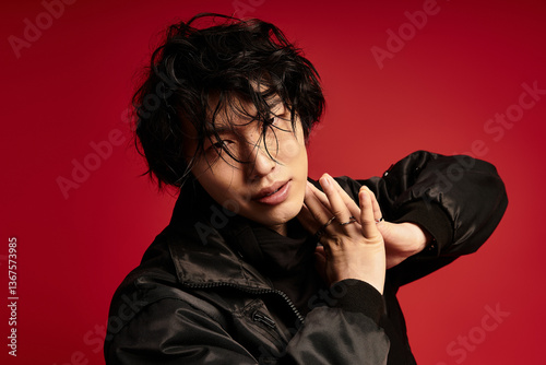 young, man, asian, red, photogenic, stylish, fashion, model, fashionable, studio, portrait, jacket, posing, adult, male, beauty, coiffure, ring, hand, elegance, trendy, apparel, clothing, vogue, expression, confidence, glamour, youth, indoor, cool, attractive, facial, artistry, lifestyle, modern, aesthetic, attitude, bliss, dream