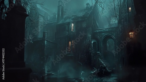 house, building, architecture, old, night, dark, fog, mist, water, gothic, stone, brick, window, door, stair, creepy, eerie, mystery, haunted, scarey, fantasy, horror, atmosphere, gloomy, moody, enigmatic, secret, shadow, light, lantern, tree, branch, leaf, path, entrance, gate, fence, wall, ruin, decay, overgrown, vintage, antique, historical, hidden