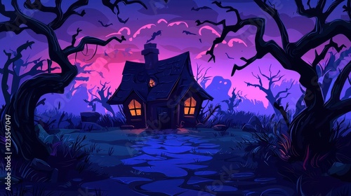 Enigmatic Halloween Cottage Nestled Amongst Spooky, Silhouette Trees and a Ghost.