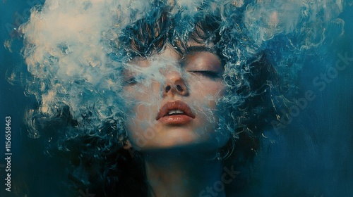 woman, face, portrait, smoke, cloud, dreamy, serene, mysterious, intriguing, artistic, painting, art, texture, colours, blue, teal, cyan, white, eye, closed, lip, mouth, hair, dark, shadow, light, canvas, oil, acrylic, style, modern, contemporary, abstract, figurative, expressionism, surrealism, fantasy, imagination, emotion, feeling, mood, atmosphere, depth, mystery, enigma, beauty, female, human