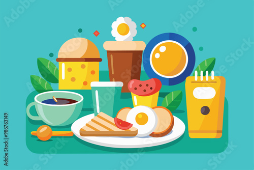 Enjoy a colorful breakfast setting featuring eggs, toast, coffee, and more delightful treats, Customizable flat illustration of breakfast