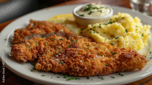 Enjoy a delicious czech meal with a crispy breaded pork schnitzel, creamy mashed potatoes, and fresh herb garnish