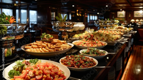Entertainment and Dining, Lavish buffet setup and live entertainment on the cruise, showcasing luxury and leisure activities available onboard.