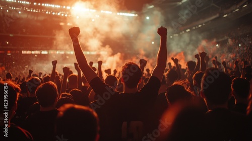 crowd, night, celebration, concert, music, festival, excitement, smoke, entertainment, audience, performance, people, atmosphere, lively, energetic, joyful, arm, raised, oneness, gathering, event, illuminated, stage, fun, vibrant, glowing, fan, party, group, silhouette, action, emotion, togetherness, scene, dusk, performer, sound, spirited, applause, mood, venue, happiness, packed