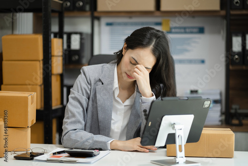 Entrepreneur is sitting at table, covering his face. small online business owner, Stress.