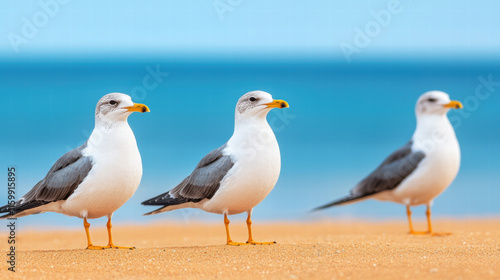 Environmental consideration. Three seagulls standing on a sandy beach by the ocean.