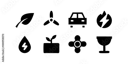 Environmental icons collection with green energy elements like recycling, plant leaves, wind turbine, water conservation, sustainable living and renewable energy flat illustrations.