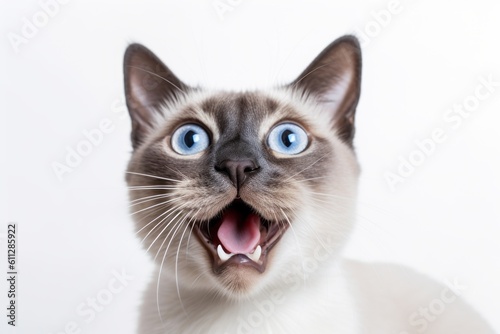 Environmental portrait photography of a curious siamese cat meowing against a white background. With generative AI technology