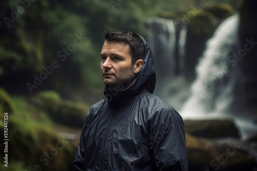 Environmental portrait photography of a pleased man in his 30s wearing a stylish hoodie against a waterfall background. Generative AI