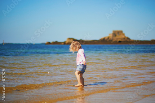 Еoddler girl having fun on the beach in Saint-Malo, Brittany, France