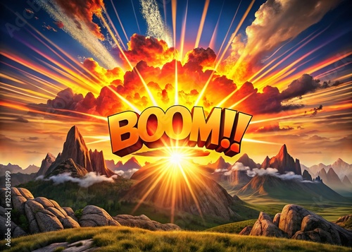 landscape, explosion, comic, superhero, lettering, boom, power, energy, dramatic, sunset, mountain, vibrant, epic, action, hero, sky, nature, fantasy, impact, fire, light, scene, background, illustration, graphic, design, art, photo, image, photo, texture, colours, style, visual, effect, digital, painting, artwork, creation, masterpiece, marvellous, spectacular, amazing, breathtaking, stunning