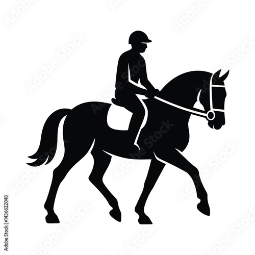 equestrian, horseriding, rider, horse, silhouette, black-and-white, animal, sport, hobby, nature, activity, movement, dynamic, profile, riding, jockey, racing, saddle, bridle, logotype, graphic, icon, vector, illustration, design element, simple, contemporary, modern, sporty, stable, farm, fashion, travel, tour tourism, equestrianism