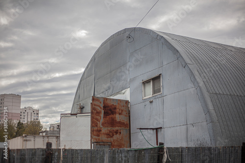 Equipment storage hangar. Industrial temporary building.