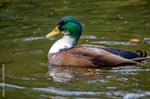Erpel mit schillerndem Gefieder auf dem Wasser