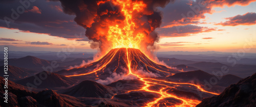 Erupting volcano with dramatic mood displaying natural destruction against a mountainous background