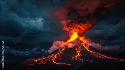 Erupting volcano with lava flow against a dramatic stormy sky.