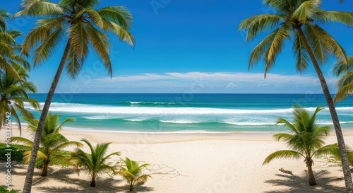 Escape to paradise with stunning turquoise waves and palm trees framing a pristine white sand beach under a clear blue sky