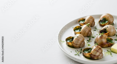 Escargots in a classic metal plate on a marble table, focus on glossy butter, bottom area left free for text.