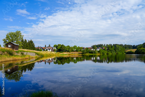Eschenbacher Teich near Clausthal-Zellerfeld in the Upper Harz Mountains. Idyllic landscape at the small lake with the surrounding nature.