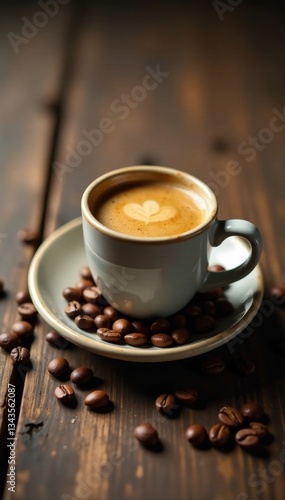 Espresso coffee cup with beans on old wooden table, vintage, rustic