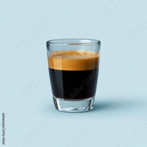 Espresso shot in a clear glass on a light blue background.