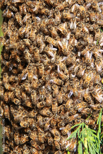swarm, bee, bee, bough, thuja, mixed, life, spring, summer, men at work, labourer, working man, work, looking up, colours, outside, outside, animal, group, daytime, person, hive, beehive, business, branch, travel, honey, queen