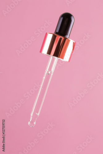 Essential clear oil or serum in pipette isolated on pink background close up. cosmetic pipette.