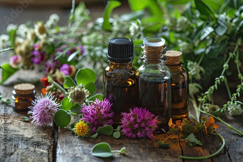 Essential Oils. essential oils and medical flowers herbs: aromatherapy, bottle, essential, flower, clover, health,