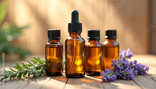 Essential oils for diffusion in beautiful bottles with flowers, relaxing composition