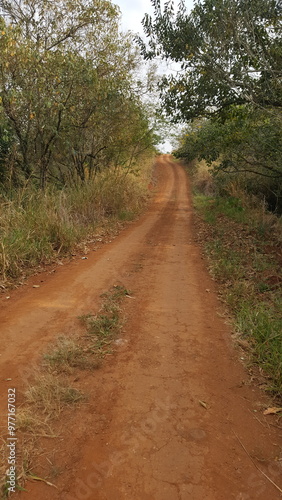 Estrada rural de chão de terra vermelha, passando por entre árvores verdes.