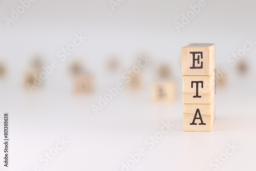 ETA acronym. Concept of estimated time of arrival written on wooden cubes isolated on white background.