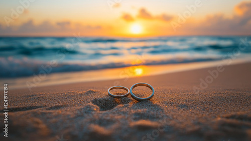 wedding band, sand, sunset, sea, love, marriage, engagement, golden hour, symbolic, forever, oneness, couple, commitment, dreamy, soft light, heartwarming, tranquil, scenic, sentimental, timeless, shoreline, serenity, honeymoon, warmth, devotion, picturesque